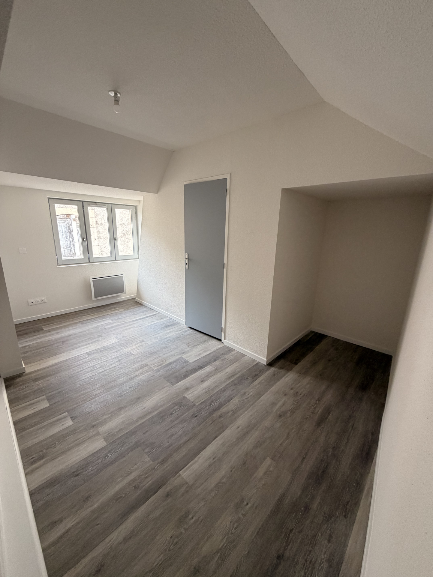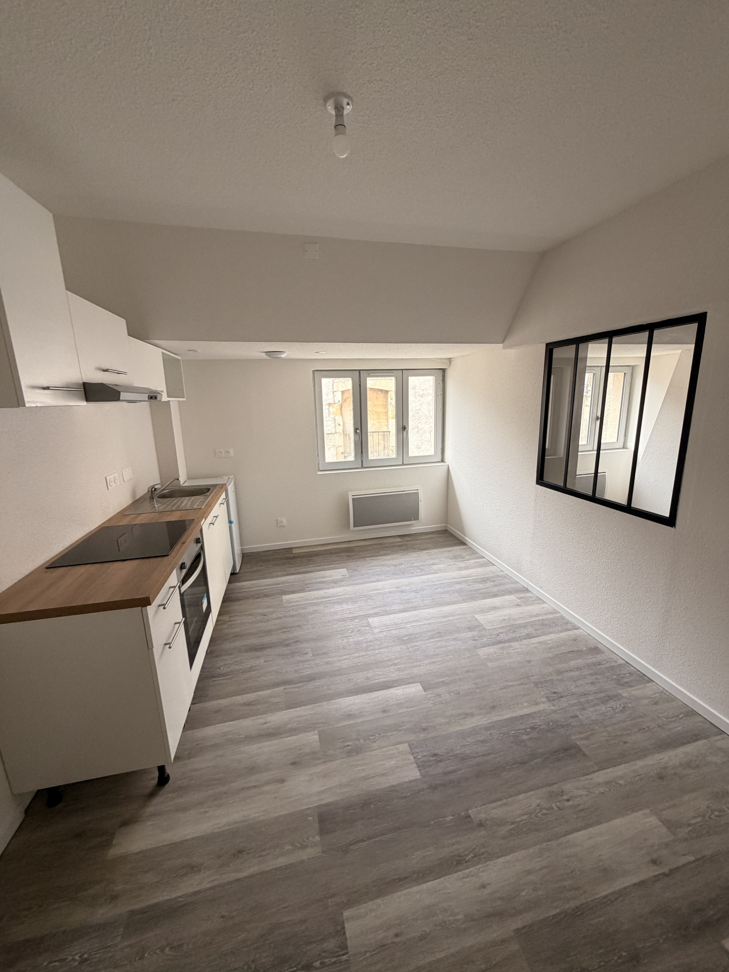 Situé au 3e étage d’un immeuble au cœur de la cité médiévale de Montluçon, cet appartement rénové offre un cadre de vie agréable. Il se compose d’une pièce de vie lumineuse avec cuisine ouverte équipée (plaque, hotte, four, rangements), d’un espace chambre, ainsi que d’une salle d’eau moderne avec douche, meuble vasque et WC. Appartement idéalement situé à proximité immédiate des commerces et commodités. Disponible immédiatement.